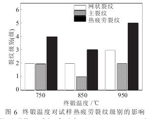 從圖可看出,隨終鍛溫度從 750℃增加至 950℃, 新型汽車曲軸的中值疲勞強度也表現出先提高后下降。 當終鍛溫度為 850℃時, 新型汽車曲軸的中值疲勞強度最大(614 MPa)。 采用不同的終鍛溫度、相同的始鍛溫度(1100 ℃)和鍛壓變形量(10%)對 38Mn VAl Mg 新型汽車曲軸試樣進行鍛壓試驗, 終鍛溫度對新型汽車曲軸試樣的熱疲勞裂紋級別影響如圖 6 所示。
