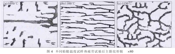 圖 4 是不同始鍛溫度鍛壓的38Mn VAl Mg 新型汽車曲軸試樣熱疲勞試驗后主裂紋形貌。