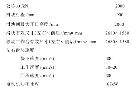 機架為鋼板焊接閉式結構,焊后均經過壁爐退火處理,充分消除焊接變形和應力,確保焊接件的精度和精度保持性,兩個主缸分別裝在機架上梁內左右兩側,滑塊置身于機身中間,其上平面和主缸連接,滑塊下平面加工有 T 型槽,用以固定上模具;滑塊四角裝有可調導軌,保證滑塊導向精度,有一定抗偏載能力,其設備下面中間位置設有移動工作臺。