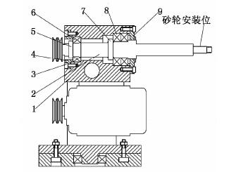 擺動支撐軸承14通過軸承壓蓋15、螺栓17安裝在回轉架2上端的軸承孔內,用于支撐擺動支撐軸16;主軸組件6安裝在擺動支撐軸16上,能實現±90°的擺動,通過鎖緊螺栓5在任意角度鎖緊;通過水平面內的回轉和垂直面內的擺動,可調整主軸組件6上的主軸軸線方向,使得主軸軸線和待維修機床主軸錐孔的母線完全平行。驅動電機4通過螺栓安裝在主軸組件6的外殼上,動力通過皮帶輪3、皮帶11驅動主軸組件的主軸旋轉,在該裝置主軸前端安裝磨削砂輪7,采用左旋螺母8壓緊,此處采用左旋螺母的目的是防止主軸旋轉過程中壓緊螺母松動。主軸組件如圖2所示,主要由主軸殼體1、主軸2、圓柱滾子軸承6和角接觸球組合軸承8等組成。角接觸球組合軸承8通過圓螺母7安裝在主軸2的前端軸承位,并用軸承壓蓋9、螺栓3安裝到主軸殼體1上;從后端裝入圓柱滾子軸承6,用圓螺母5固定軸承內圈,用軸承壓蓋4、螺栓3固定軸承外圈;安裝完成后測試主軸前端安裝砂輪位置的徑向跳動,不能超過0.015mm,這樣才能保證磨削修磨的精度。