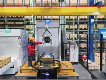 “最長的柔性產線,用最少的人”當走進車間,這條柔性線真實矗立在眼前時,其所帶來的震撼無以名狀。只見,長度近百米、高度近八米的五層立體庫整齊排列,庫內集成有一臺垛機,以每分鐘 210 米的超快速度,高效且有序地將各類托盤以及托盤上的毛坯、在制品等搬運至產線內的 6 臺機床和 3 個裝載站內。所有工序僅依靠兩位技術人員,通過操作控制面板與裝夾零件來完成。