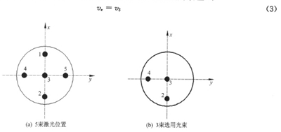 三維激光測振儀在測量物體三維信息時,5束激光通過聚焦透鏡匯聚在同一點,并測得沿各自光束方向的速度分別為V1,V2,V3,V4,V5,如圖2(a)所示,選用其中正交的3束激光來獲得三維振動信息呻0|,此處選用光束2,3,4,如圖2(b)所示,光束3可以直接測量物體沿Z方向的振動分量,即