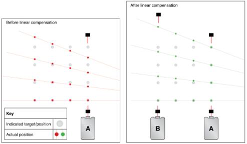 如圖2所示,在A處采用單光束激光檢測某一軸的定位精度并補償合格后,由于運動平臺的多自由度誤差的作用,使得在同一運動軸的在其它部位所得到的定位精度并不一定能滿足精度要求,如圖2所示,在A位置進行螺距誤差補償后B位置測量的誤差還是沒有解決。