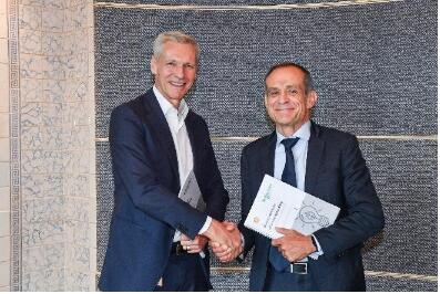 施耐德電氣董事長兼首席執行官趙國華(Jean-Pascal Tricoire)和殼牌項目和技術總監哈里·布雷科曼斯(Harry Brekelmans)(左)作為代表達成全球戰略合作