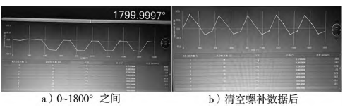 利用激光干涉儀檢測位置精度,設置每 30°讀取一次數據(30°一打,一圈 12 個點),由圖 5a)可看出,在 B 軸旋轉 0°~1800°之間,0°~360°和 360°~1800°定位精度誤差的規律差異較大。為便于對比觀察,在清空螺距補償數據后,再次檢測位置精度(圖 5b)),發現其規律基本一致。經過對比發現,B 軸螺距補償數據只是在0°~360°之間生效,其他范圍內無效(誤差過大),由此聯想到檢查參數 1006,該參數主要作用是設定伺服軸類別(直線軸或旋轉軸)以及各類坐標值的舍入方式,發現 1006#0(ROTx)和1006#1(ROSx)均為 0,查閱參數說明書可知,該參數設定 B 軸“存儲型螺距誤差補償為直線軸類型”,于是將 1006#0 由 0 改為 1,即設定 B 軸“存儲型螺距誤差補償為旋轉軸類型”,再次使用激光干涉儀在 0°~1800°之間檢測位置精度,誤差均在正常范圍內,故障徹底排除。