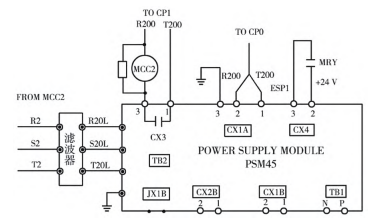 故障診斷分析及解決方案:該故障如果直接從報警內容入手,故障原因涉及面較廣(包括伺服模塊、主軸模塊、電源模塊以及相關電纜連接均有故障可能)。可從“空開 CP1 跳閘”尋找突破口,該空開下端接有 AC 200 V 的兩根電纜(線號分別為R200 與 T200),從機床電氣原理(圖 2)可知,T200 接入電源模塊POWER SUPPLY MODULE(PSM)的 CX3 接口,再從該接口出來后接入主接觸器 MCC 線圈的一端,線圈的另一端接的是R200,因此 CP1 跳閘原因可能是空開下端存在短路等異常情況。