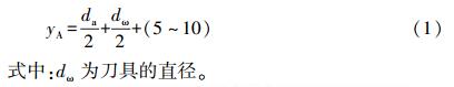 加工走刀路線如圖 2 所示,A 點為起刀點,刀具從 A 點出發,首先快速工進至 e′點,建立刀具左補償,刀具中心偏移至 e′點,由 e′ 點切入工件至 e 點切出,這樣就完成了一個齒槽的加工,通過坐標系旋轉法,逆時針銑削完全部齒槽,最終回到 e′點(刀具中心偏移至 e2 點) ,最后退回到 A 點,同時取消刀具補償。 A點 y 坐標可按下式確定[5-6]: