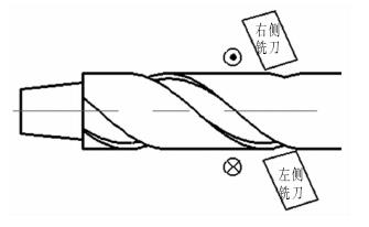 采用盤銑刀加工螺旋鉆桿時,兩側的受力情況不一致,鉆桿左側受到銑刀豎直向下的力,鉆桿右側則受到銑刀豎直向上的力,如果左右兩側銑刀設置在同一平面內,勢必會造成鉆桿左右側受力不均,易造成打刀現象,為此,將左側銑刀整體墊高 0.1 mm,右側銑刀整體下降 0.1 mm,以緩解鉆桿受力不均情況。 銑削鉆桿受力示意圖如圖 3 所示。