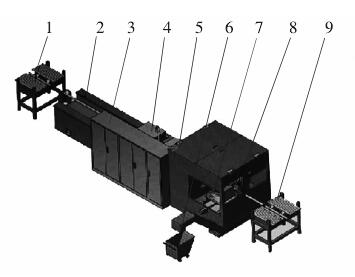 1. 上料裝置 2. 床身 3. 泵站及電控系統 4. 工件旋轉給進裝置 5. 床