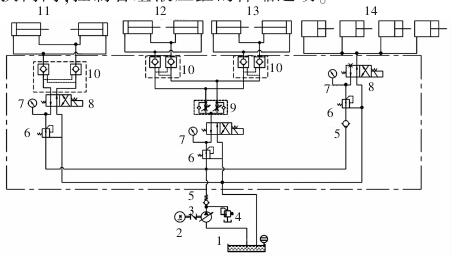 液壓系統總體原理圖如圖 4 所示,前跟刀架油缸、后跟刀架油缸動作要求一致,以保證鉆桿同時被抬起或者放下,為此,液壓系統中設置有分流閥,保證各動作均勻一致。 輔助跟刀架、前后跟刀架、液壓鎖各部分的工作壓力均不相同,但都共用 1 個液壓泵站,為此,各系統均設有減壓閥,以保證各部分所需壓力。跟刀架均設有液壓互鎖裝置,保證液壓缸在夾緊時能相互鎖住,不發生移動。設有兩位四通電磁換向閥,控制各組液壓缸的伸縮運動。