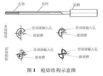 對于內排屑加工系統主要適用場合在直徑>Φ18 mm 的深孔加工; 而外排屑加工系統中深孔扁鉆和深孔麻花鉆由于加工深度的制約,無法完成對于長徑比>50 的超長小直徑深孔的加工。通常長徑比 L/D>10 的超長小直徑深孔( Φ2 ~Φ20 mm) 均采用深孔槍鉆加工工藝。目前航空航天、軍事和民用產業中,超長小直徑深孔加工的需求越來越多。例如: 在航天航空業中各類飛機艙門中導軌孔以及模具行業中大型汽車覆蓋件的注塑模具水道孔。